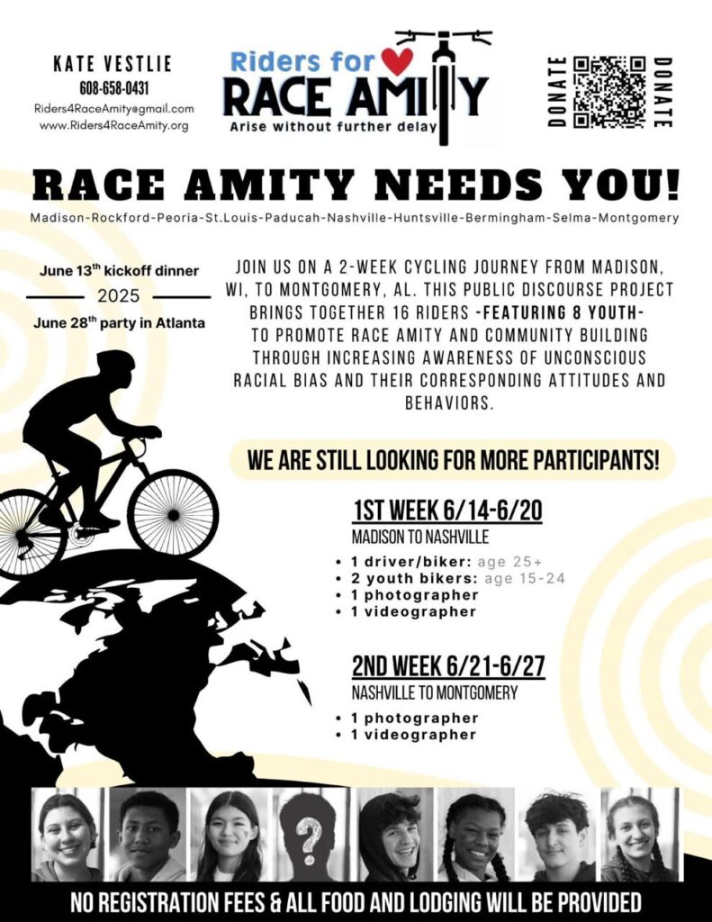 Join us on a 2-week cycling journey from Madison, 2025 – Wi, to Montgomery, Al. this public discourse project brings together 16 riders -featuring 8 youth-to promote race amity and community building through increasing awareness of unconscious racial bias and their corresponding attitudes and behaviors.